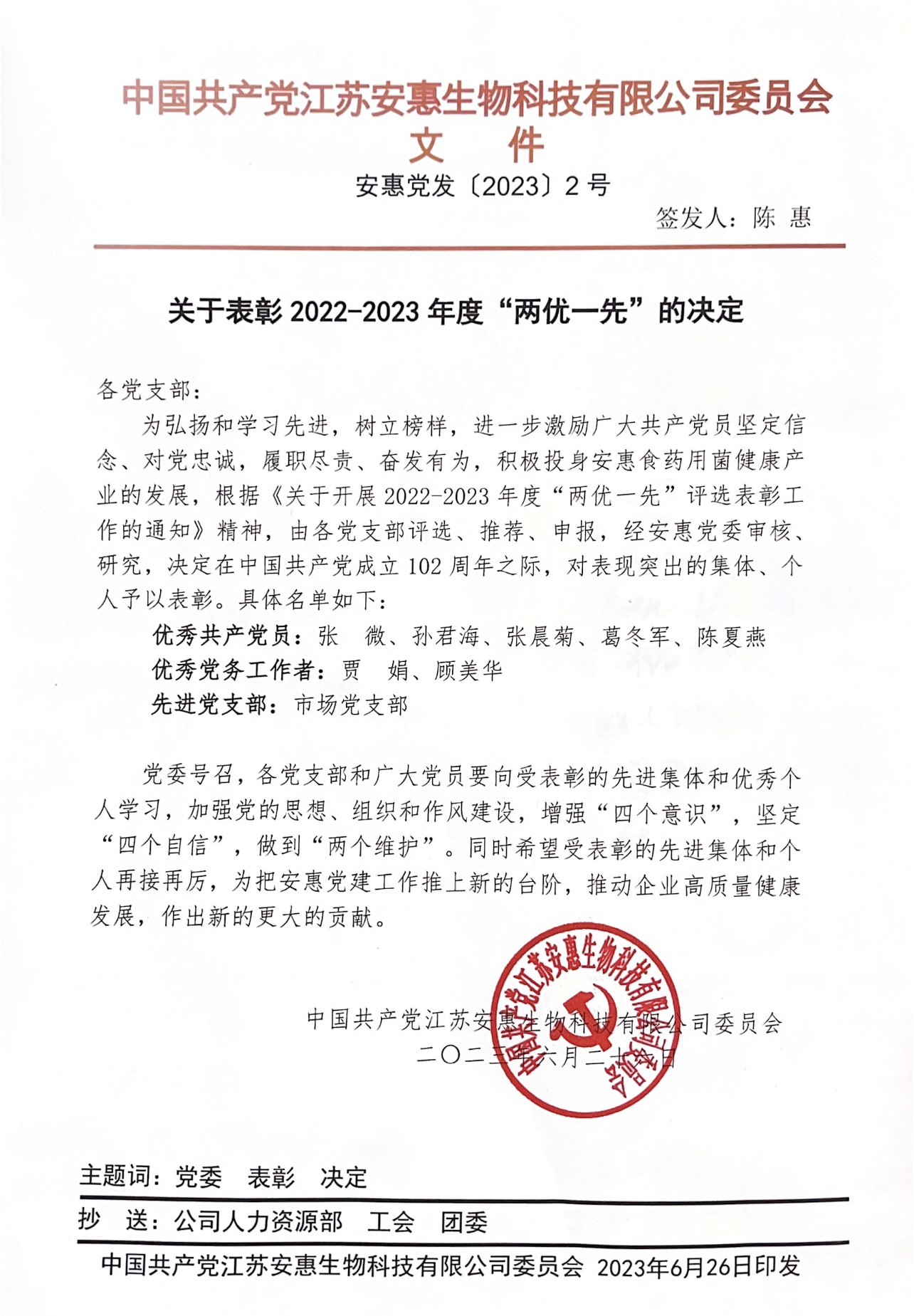 安惠黨委關(guān)于表彰2022-2023年度“兩優(yōu)一先”的決定
