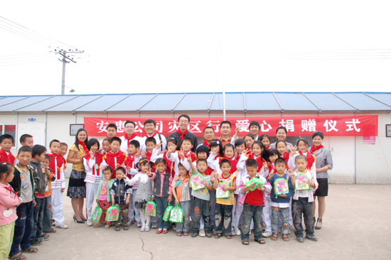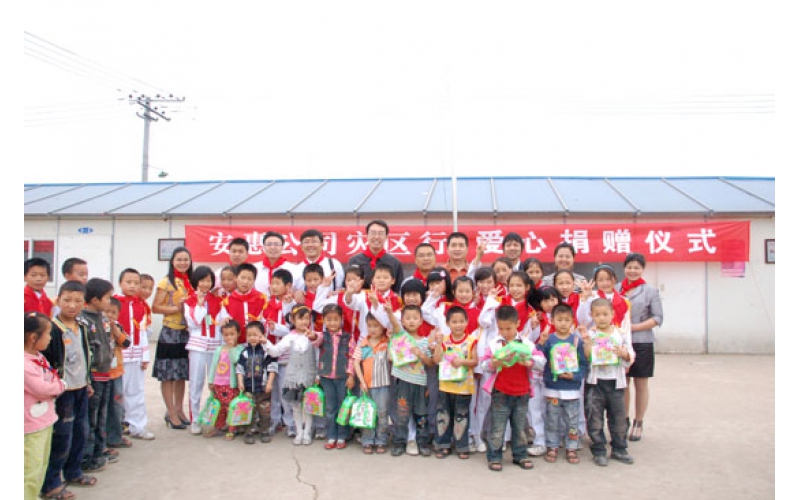 2009年5月12-13日,安惠公司舉行大地震周年系列紀(jì)念活動(dòng)。副總經(jīng)理柯建民再赴德陽(yáng),給綿竹拱星小學(xué)孩子們送去“愛(ài)心包裹”。