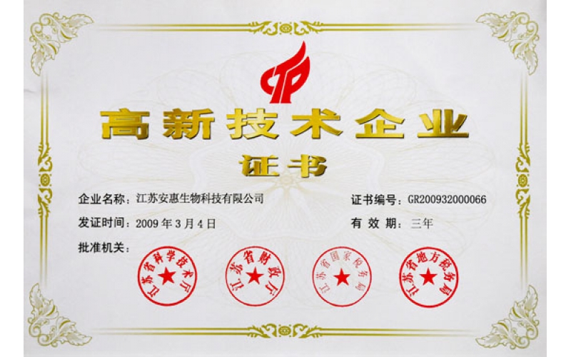 2009年3月4日,安惠公司成為國(guó)家高新技術(shù)企業(yè)。