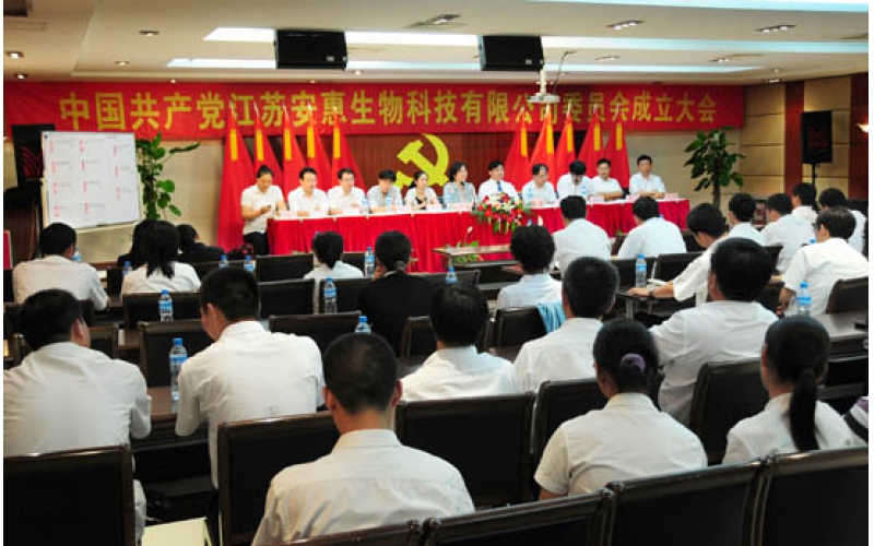 2009年6月30日,中國(guó)共產(chǎn)黨江蘇安惠生物科技有限公司委員會(huì)成立。開(kāi)發(fā)區(qū)黨工委副書記、管委會(huì)副主任嚴(yán)憲,“兩新”工委書記、組織部副部長(zhǎng)邵平,紀(jì)工委副書記王艷青等出席成立大會(huì)。