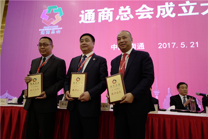 2017年5月21日下午,通商總會(huì)第一次會(huì)員代表大會(huì)隆重召開。會(huì)議通過了通商總會(huì)章程,選舉產(chǎn)生了通商總會(huì)執(zhí)行會(huì)長(zhǎng)、副會(huì)長(zhǎng)和理事。安惠公司董事長(zhǎng)陳惠與其他兩人當(dāng)選為執(zhí)行會(huì)長(zhǎng),南通市委副書記、市政府市長(zhǎng)韓立明為他們授牌。